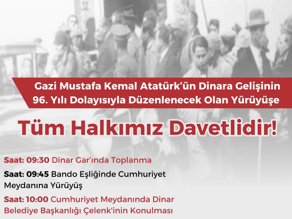 Atatürk’ün Dinar’a gelişinin 96. yıl dönümü dolayısıyla düzenlenecek yürüyüş ve anma programına tüm vatandaşlarımız davetlidir.