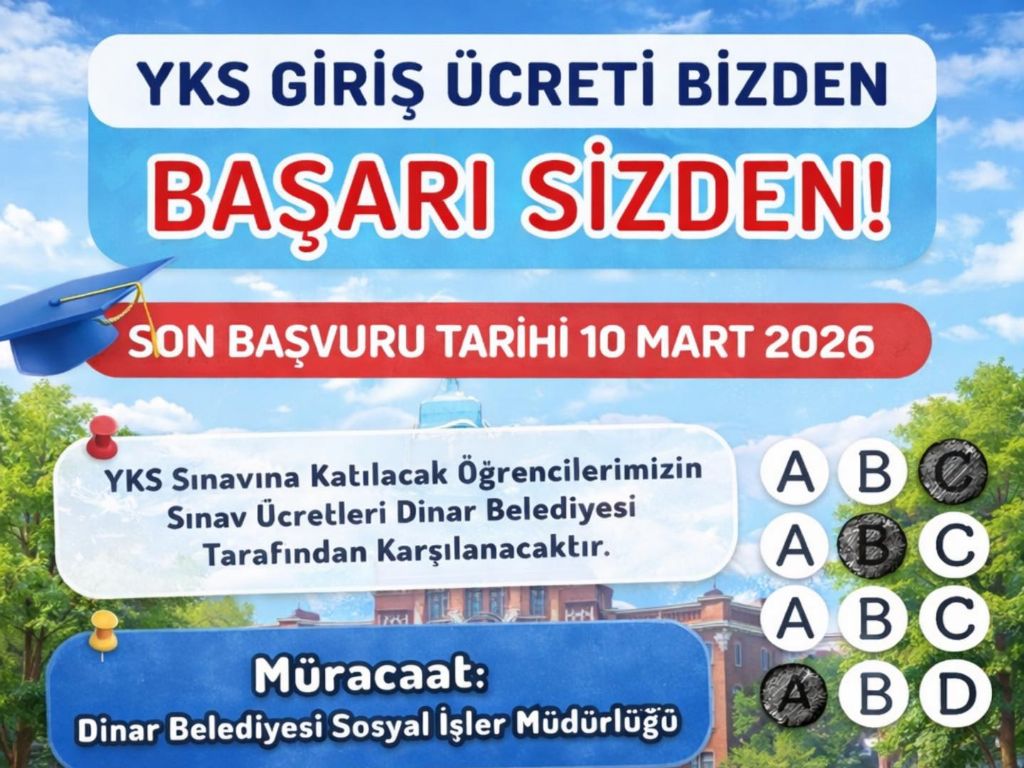 Belediye Başkanımız Veysel Topçu’nun talimatlarıyla, YKS’ye girecek öğrencilerimizin sınav ücretleri Dinar Belediyemiz tarafından karşılanacaktır.