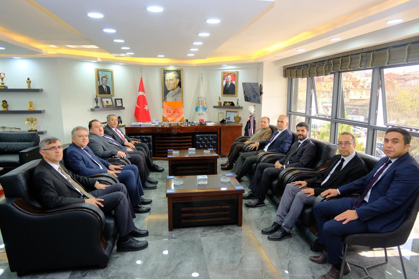 Afyon Kocatepe Üniversitesi (AKÜ) Rektörümüz Prof. Dr. Mehmet Karakaş ve beraberindeki heyet, Dinar Belediye Başkanımız Veysel Topçu’yu makamında ziyaret etti.